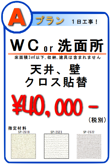 家具移動が無い等、一定条件を満たせば追加料金一切なしのパック料金です!!(残材処理費、諸経費はサービスです!!)